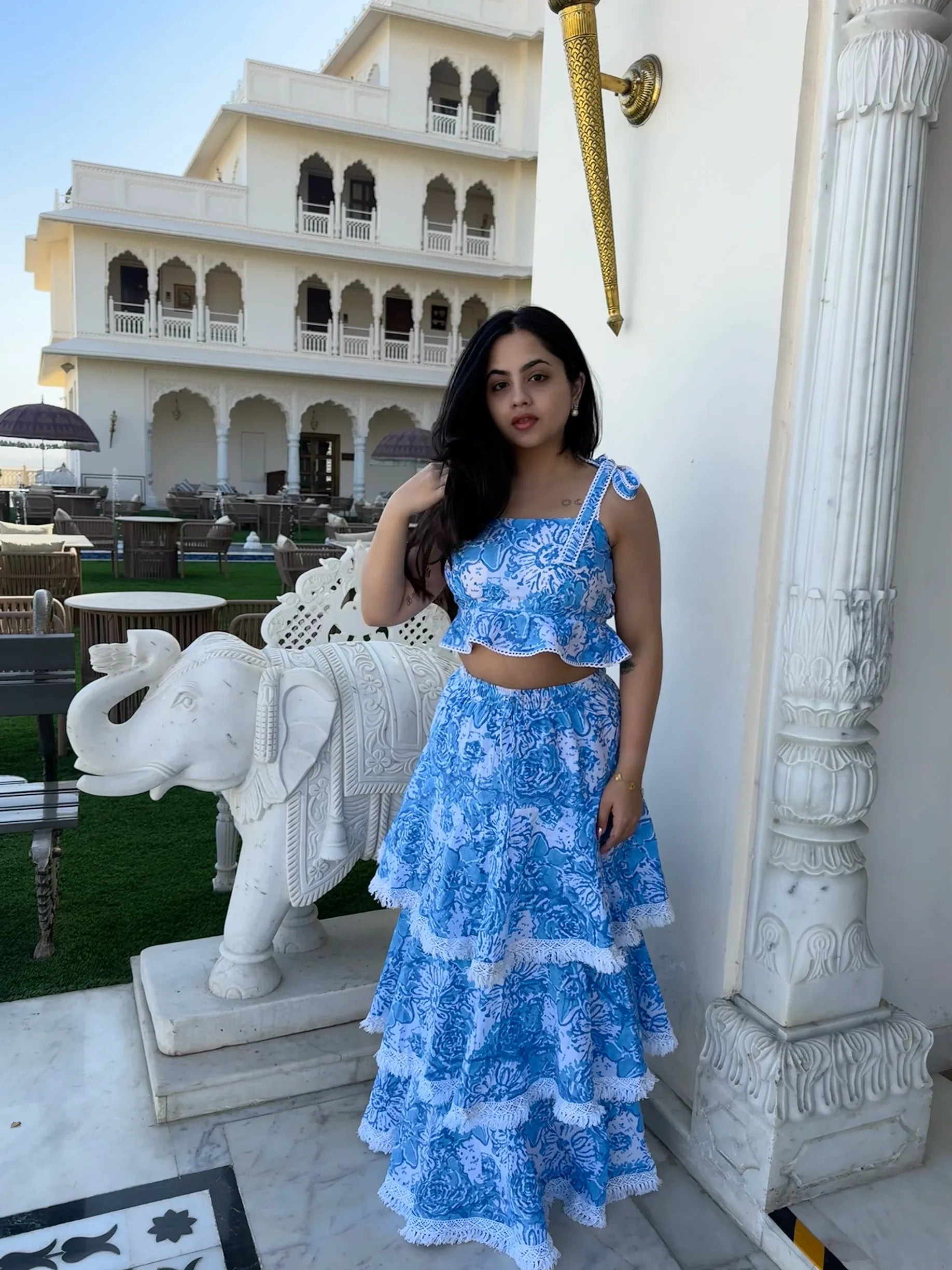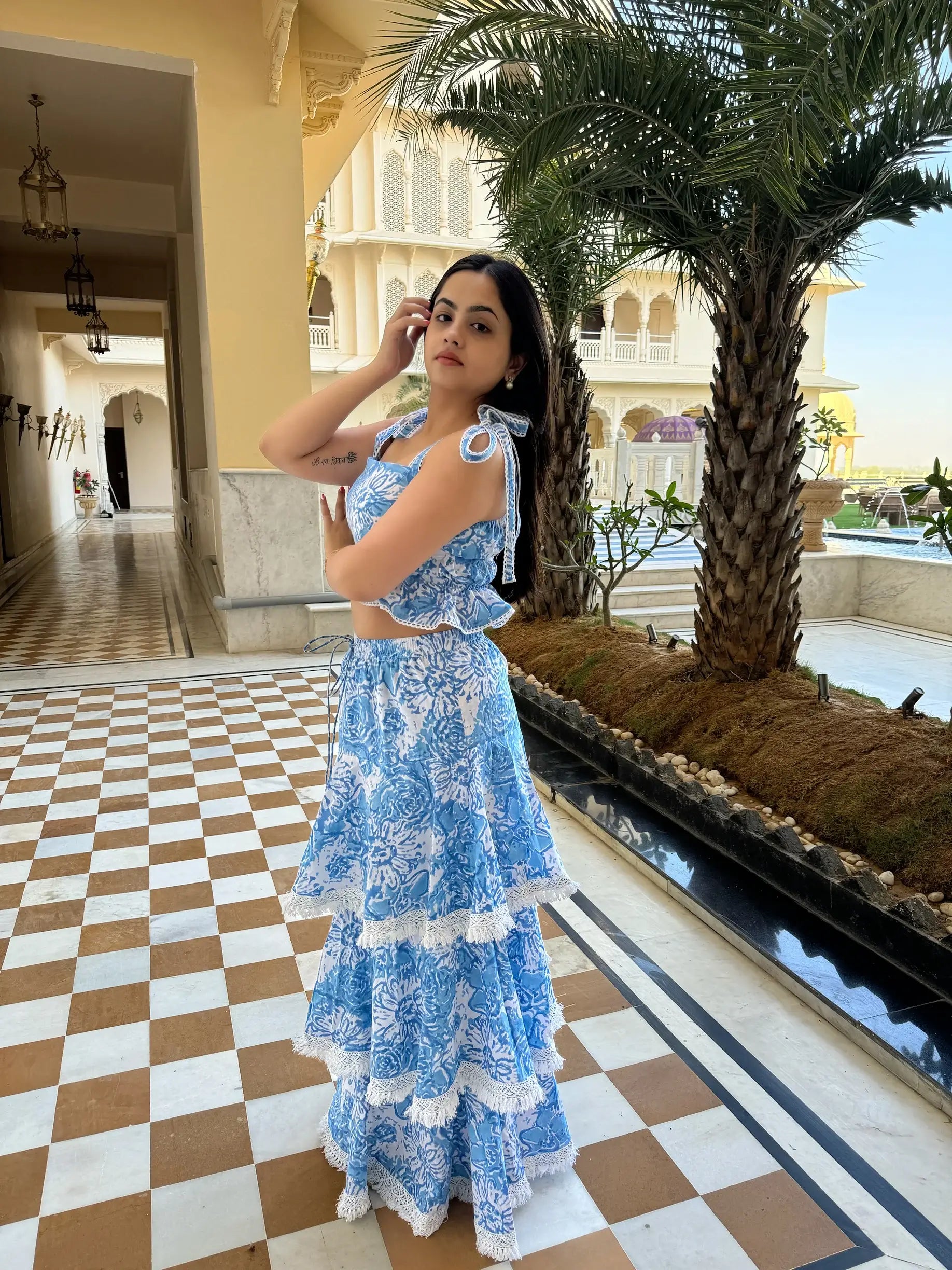 This printed cotton coord set features a peplum crop top with padded cups and shoulder tie details, paired with a layered, frilled skirt adorned with lace trims. The skirt offers all-day comfort with its elasticated waist and adjustable drawstring—perfect for effortless style and comfort.